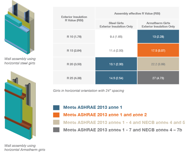 - Higher, effective wall assembly R values are achieved using lower values of external insulation. For example, to obtain an R value of R-13 minimum to meet ASHRAE zone 1, steel girts require and external R 20; whereas Armatherm girts require only R 10.